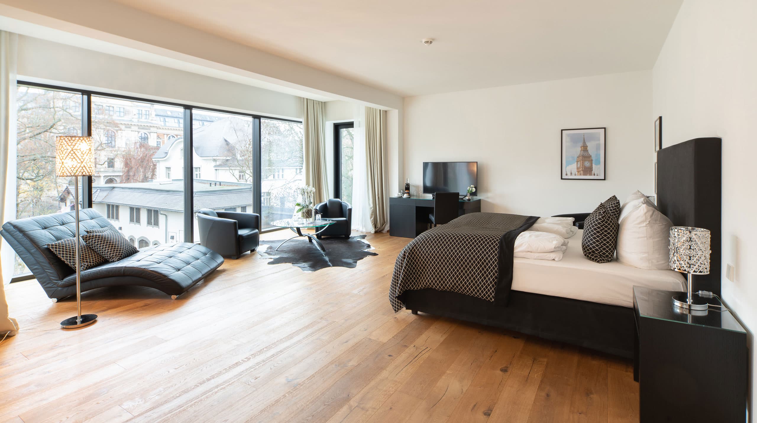 Die hochwertige Ausstattung und die bodentiefen Fenster mit Blick zum Konsulat und in den Garten versprechen einen entspannten Aufenthalt mit der ganzen Familie.